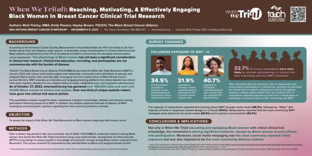 TOUCH, The Black Breast Cancer Alliance along with Morehouse School of Medicine, Breastcancer.org, the Center of Healthcare Innovation, Citizen, and LRW published “Increasing Clinical Trial Participation of black Women Diagnosed with Breast Cancer” research in the Journal of Racial and Ethnic Health Disparities in 2023. The published study took a community-based participatory research approach to understand the barriers which contribute to this disparity, in the community’s own words and with research design and data collection from trusted members of the community.